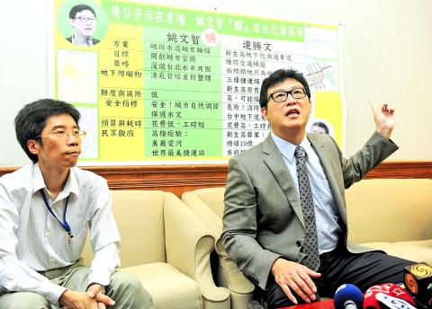 Yao yesterday accused Lien of barely understanding Taipei, saying that along with the water channel, there is the small issue of the existing underground transport lines of the Taiwan High Speed Rail Corp (台灣高鐵 ) line 6m below ground, the Taiwan Railways line 10m underground and two Mass Rapid Transit lines.