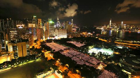 “Vindicate 6/4,” crowds shouted, waving banners, as the somber candle-lit vigil began in Victoria Park.