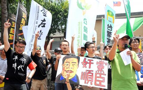 “We’re in the game with the government of President Ma Ying-jeou (馬英九) if reviews of the bills on free economic pilot zones, the cross-strait service trade agreement and an oversight mechanism to monitor cross-strait pacts are scheduled during the extra session,” Dennis Wei (魏揚), a member of the Black Island Youth Front, said outside the legislature in Taipei. “We are here to declare war on the government on this Friday the 13th.”