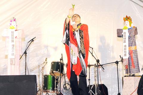 Decorating the stage with ornaments traditionally used for funeral events, such as white banners, pairs of paper dolls, mini pagodas and canned drinks, the protesters, mobilized by the Black Island Youth Front and the Taiwan March and Democracy Tautin, started the rally with a student dressed in a Taoist priest’s outfit performing an exorcism.