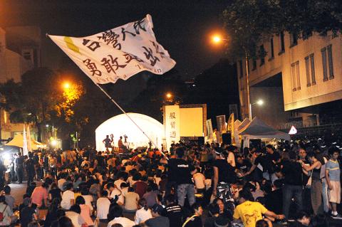 “The purpose of the ritual is to send away all the ‘dirty things,’ and the dirtiest thing in this country is the government under Ma’s leadership,” said Dennis Wei (魏揚), a Sunflower movement student leader. “If the government hasn’t learned its lesson by attempting to pass the cross-strait service trade agreement and it still want to pass the pilot zones plan by force, we will not hesitate to fight it.”