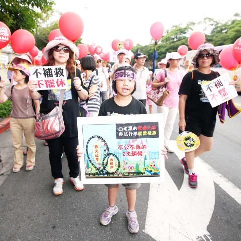 Demonstrators took to the streets of Taipei yesterday against a new mechanism in senior-high school admittance, which they say is unfair because it does not take into account students’ grades.