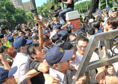 Dozens of activists vaulted the front gate of the Legislative Yuan in Taipei yesterday morning in protest over the controversial free economic pilot zones draft bill being put on yesterday’s legislative agenda, but were dispersed by police, who handcuffed and arrested some of the demonstrators about an hour after they jumped the fence.