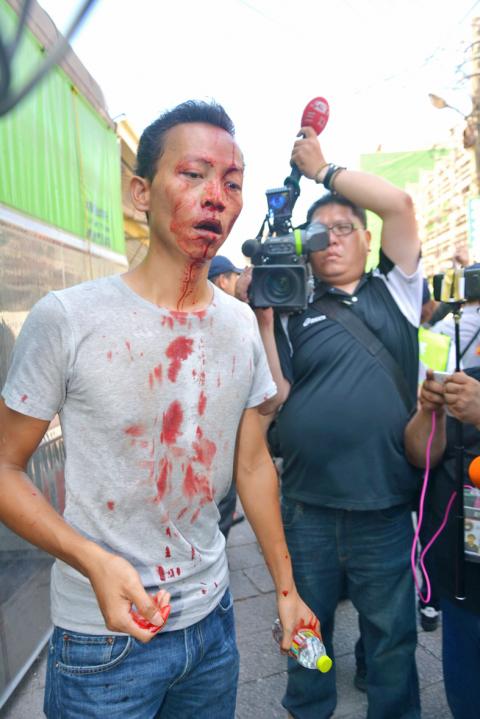 With a bloody face, a wound on his forehead and blood-stained clothing, Liang Po-chou (梁伯洲) told reporters at the square in front of the temple that he was assaulted by five or six people using steel blowpipes.