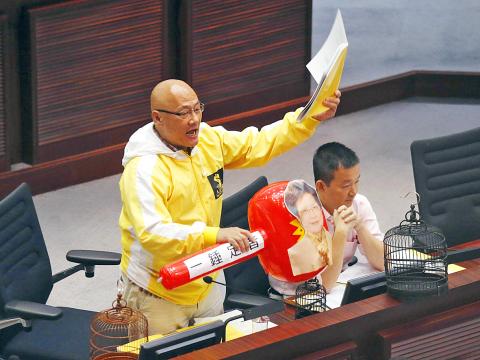 Fellow legislator Albert Chan (陳偉業) ripped up a copy of the report, shouting “Fake report, fake consultation,” as he was removed.
