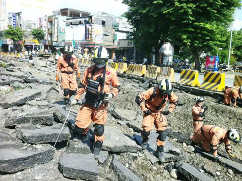 Three days after the first of several gas explosions hit Greater Kaohsiung last week, rescue workers yesterday continued to search for two missing firemen, with the Kaohsiung Fire Bureau saying it suspected that they could have been “burned to ashes” due to their proximity to the blasts.