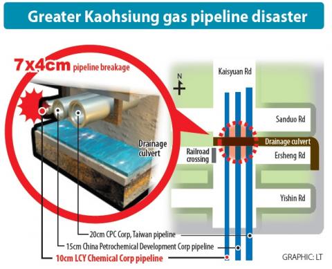 The office recently isolated the potential source of the explosion to a culvert at the intersection of Ersheng and Kaisyuan roads, confiscating a section of a heavily corroded pipeline used by LCY Chemical to store and deliver propene, the gas blamed for the explosions. Culverts should not have any pipelines attached to them, the office said.