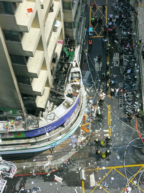 A resident surnamed Kao (高) said the windows on the building’s first to sixth floors were shattered and glass shards flew as far as 10m from the site of the blast.