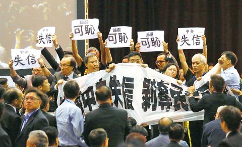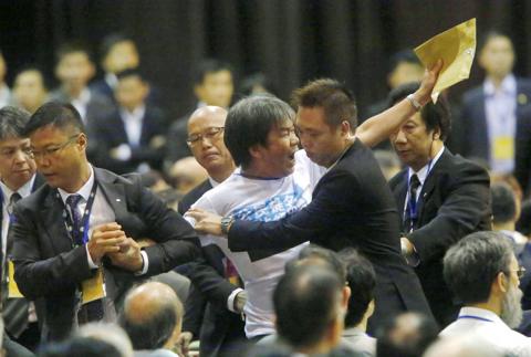 As Li approached the lectern to speak at the Asia World Expo convention center, veteran dissident Legislator Leung Kwok-hung (梁國雄) started shouting him down, his fist raised in the air. He was joined by a dozen pro-democracy lawmakers and some younger demonstrators who unfurled a banner and chanted: “The central government broke its promise, shameless.”
