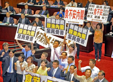 DPP lawmakers held up banners calling for Jiang to apologize and for Minister of Health and Welfare Chiu Wen-ta’s (邱文達) resignation, saying that food safety, safety in the construction industry and national security have been neglected during their terms.