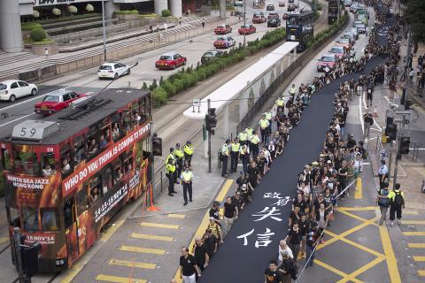 Thousands of pro-democracy activists clad in black marched silently through Hong Kong yesterday, holding banners saying they felt betrayed and angry at Beijing’s refusal to allow fully democratic elections for the territory’s next chief executive in 2017.