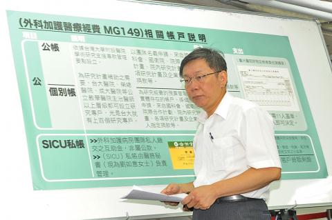 Independent Taipei mayoral candidate Ko Wen-je (柯文哲) yesterday went on the attack against repeated accusations of corruption and money laundering by making public the details of three bank accounts — two for the National Taiwan University Hospital and one of his own — as well as his tax filings from 1995 to last year. He challenged Chinese Nationalist Party (KMT) rival Sean Lien (連勝文) to do the same.