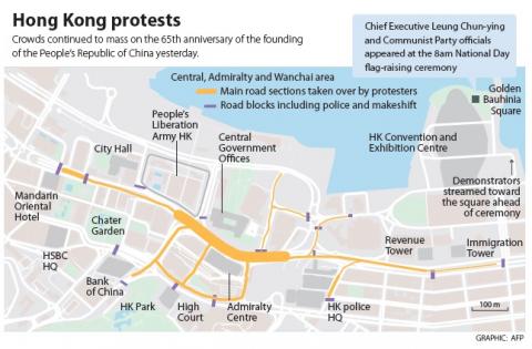 Many had feared police would use force to move crowds before yesterday’s celebrations marking the anniversary of the foundation of the People’s Republic of China in 1949. Those fears proved unfounded and police stayed in the background.