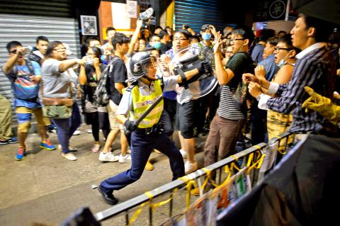 Dozens of police equipped with riot gear pushed into a crowd of angry demonstrators in the Mong Kok district early yesterday, striking at them repeatedly with batons.