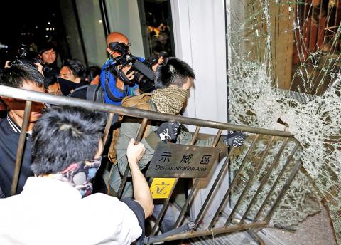 At least one demonstrator made their way into the building, the Apple Daily newspaper reported.