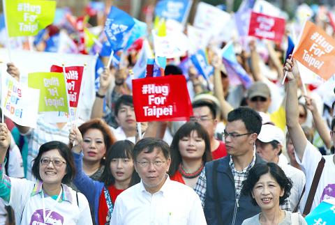 “I would like to thank everyone for cheerfully taking part in the parade, embracing Taipei with love, welcoming the approaching mayoral election with feelings of festivity and looking forward to realizing the change,” Ko told his supporters in front of Taipei City Hall.