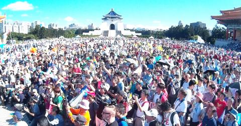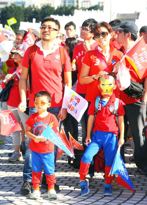 Including samba dancers, people dressed as characters from fairy tales, giant balloons in the shape of a four-headed dragon, Mother Teresa — and the first Presbyterian missionary to northern Taiwan, George Leslie Mackay — as well as decorated floats and people holding colorful flags reading “Hug for Taipei,” thousands paraded from Liberty Square to Taipei City Hall in what appeared to be a festival celebration rather than a campaign event.