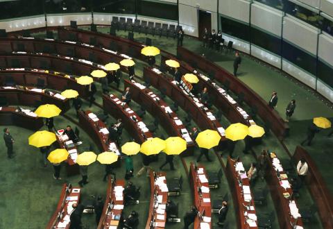 More than 20 lawmakers carrying yellow umbrellas — the symbol of the pro-democracy movement — walked out of the legislative chamber as the consultation document was about to be presented by Hong Kong Chief Secretary Carrie Lam (林鄭月娥).