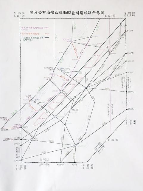 CAA Director-General Jean Shen (沈啟) said that Beijing announced an updated aviation safety bulletin on Monday morning which included four new air routes near China’s southeast coast. Among them, a route labeled M503 is nearly parallel to the middle line of the Taiwan Strait, coming as close to the line as 7.8km.