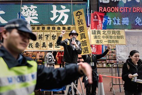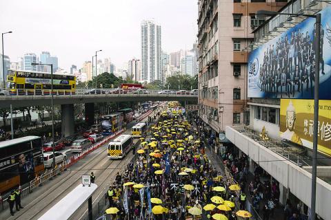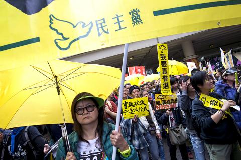 Thousands of pro-democracy protesters took to the streets of Hong Kong yesterday for the first time since mass demonstrations shut down parts of the territory for more than two months during the Umbrella movement from Sept. 26 to Dec. 15 last year.
