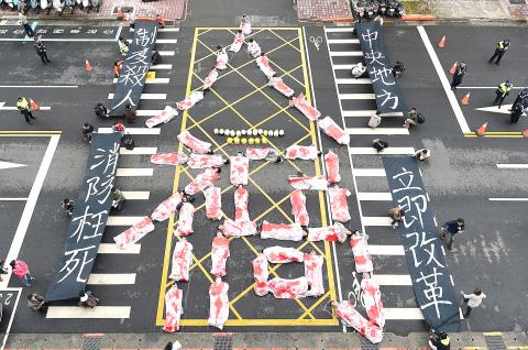 Nearly 100 firefighters and their supporters rallied outside the Ministry of the Interior in Taipei yesterday, demanding reforms in the wake of a recent blaze that claimed the lives of six firefighters in Taoyuan.