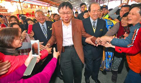 Taipei Mayor Ko Wen-je (柯文哲) yesterday continued his marathon of temple visits on the second day of the Lunar New Year holiday, greeting temple-goers and distributing “lucky money” despite the discovery of a death threat at Taipei City Hall on Thursday.