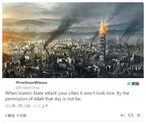 The government and the military said they are the on alert following an apparent threat the Islamic State (IS) group made through a Twitter post, which featured an illustration of Taipei coming under attack, with the landmark Taipei 101 in flames and several other buildings on fire.