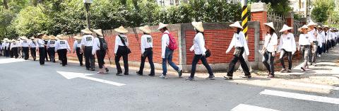 Wearing their signature bamboo hats, the protesters made seven laps of the Legislative Yuan compound in silence, in reference to the biblical Battle of Jericho, in which the walls of Jericho were said to have crumbled after the Israelite army marched seven times around the city.