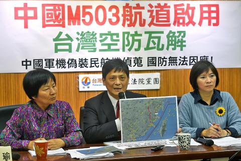 The Taiwan Solidarity Union (TSU) yesterday criticized the government after China announced that it would officially inaugurate the M503 flight route despite protests from Taiwan, saying that President Ma Ying-jeou’s (馬英九) “peaceful development in cross-strait relations” was at the cost of Taiwan’s security.