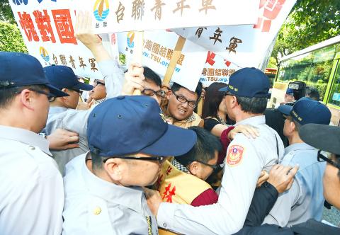 “When we threw paint at the presidential residence, the Presidential Office immediately released a statement condemning our protest as an ‘act of violence,’ and urged us to remain peaceful and rational,” TSU youth director Chang Chao-lin (張兆林) said through a megaphone. “However, when China displays its intention to violate Taiwan’s sovereignty, Ma does not dare to say anything.”