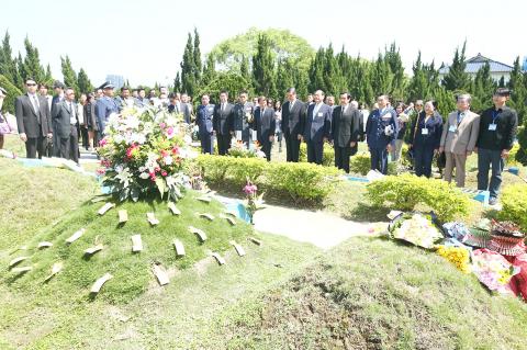 President Ma Ying-jeou (馬英九) attended an annual spring memorial service under tightened security as protesters held signs urging the government to protest to China over the air route.
