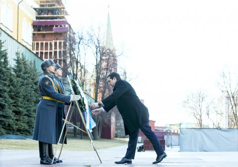 The Greek prime minister — who traveled to Moscow last year prior to his election win — is taking part in a wreath-laying ceremony at the Tomb of the Unknown Soldier by the Kremlin ahead of his sit-down with Putin.