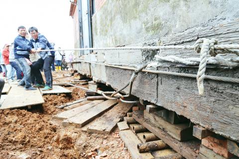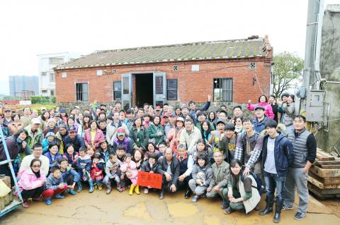 More than 100 people gathered in a mostly flattened ancient village in Taoyuan’s Guishan District (龜山) to help move a half-century-old house away from a planned road to preserve the last remnants of the community.