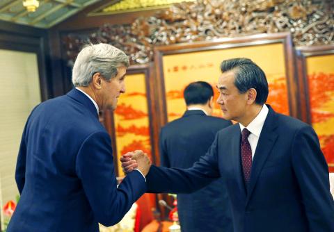 US Secretary of State John Kerry and US Department of State officials yesterday met Chinese leaders, vowing a tough line over Beijing’s island-building in disputed waters.
