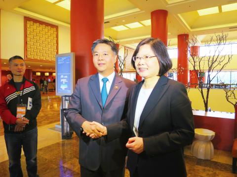 On Saturday, she met with US Representative Ted Lieu (劉雲平), a Taiwanese-American whose grandparents still live in Taiwan, to discuss labor-related issues and the Trans-Pacific Partnership.