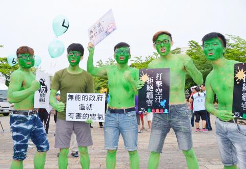 College students — wearing masks of “No-Face,” a character from Japanese filmmaker Hayao Miyazaki’s Spirited Away — said Yunlin has borne the brunt of deteriorating air quality in Taiwan in recent years, but the Environmental Protection Administration (EPA) has downplayed the severity of the problem and adopted a passive attitude in addressing air pollution.