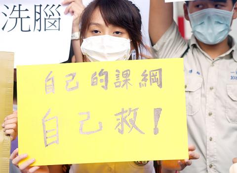Holding two large banners that read “anti-brainwashing” and “oppose the adjustments made to the curriculum guidelines,” as well as various smaller placards expressing their dissatisfaction, dozens of students, some wearing their school uniforms, called for Minister of Education Wu Se-hwa (吳思華) to listen to their demands outside the ministry yesterday afternoon.