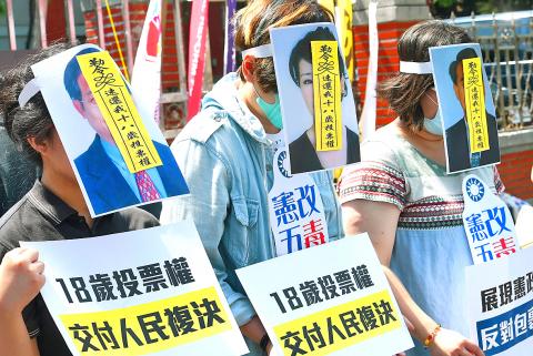 Civic groups yesterday rallied outside the Legislative Yuan in Taipei — where interparty negotiations over constitutional amendments were taking place — to urge legislators to enact proposals that would lower the legal voting age and the threshold for political parties to secure legislator-at-large seats.