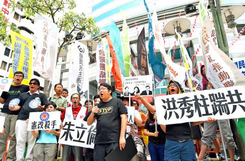 As scores of activists yesterday protested outside Chinese Nationalist Party (KMT) headquarters over the legislature’s failure to pass proposed constitutional changes on Tuesday, KMT Chairman Eric Chu (朱立倫) blamed the opposition for obstructing the amendments for its own ends.