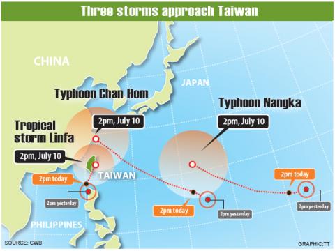 According to the bureau the high-pressure system in the Pacific Ocean and Typhoon Chan Hom — which is about 2,700km from Taiwan — could alter Linfa’s course.
