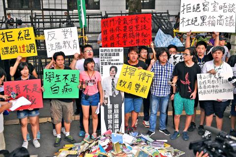 Northern Taiwan Anti-Curriculum Changes Alliance spokesman Wang Pin-chen (王品蓁) said that the protest was forced by the ministry’s chilly response to students’ requests for talks, with past student-led marches and other actions leading only to ministry statements that “whoever shouts loudest is not necessarily right.”