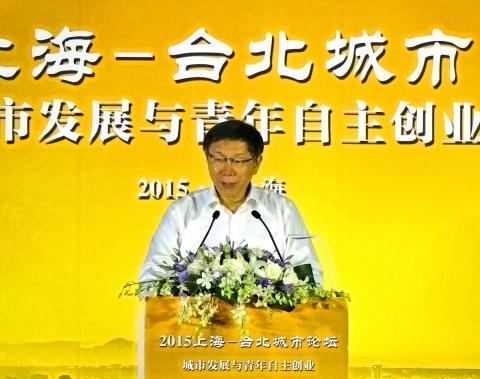 Taipei Mayor Ko Wen-je (柯文哲) yesterday expounded on his views on cross-strait relations at the Taipei-Shanghai forum, touting what he called the “2015 new standpoint,” which he said is built on “four reciprocal processes” and a motif that both sides of the Taiwan Strait are “one family.”