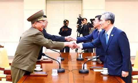 The meeting at the demilitarized zone (DMZ) village, known for its sky-blue huts and grim-faced soldiers, was set for half an hour after North Korea’s previously set ultimatum demanding that the South halt its loudspeaker propaganda broadcasts along the border or face military action.