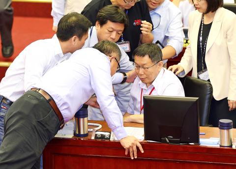 Ko, visibly angered, also pounded his desk upon hearing Hsu’s remark. The mayor at one point attempted to stand up in protest, but was stopped by Taipei Deputy Mayor Charles Lin (林欽榮).