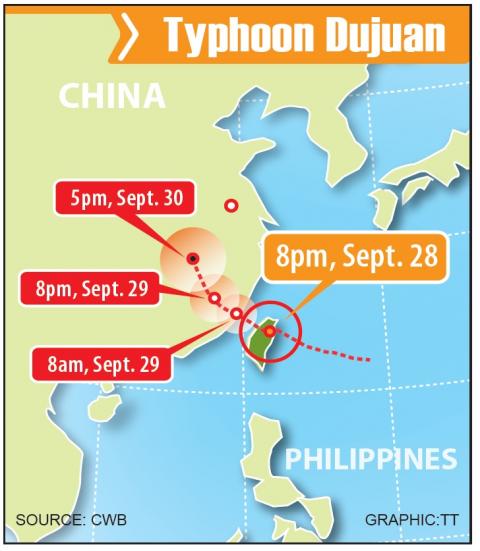 The Central Weather Bureau (CWB) said Dujuan made landfall at Suao Township (蘇澳) in Yilan County at 5:40pm. Suao brought gusts of wind reaching 243.7kph, the second-highest on record since a weather station was established in the township 34 years ago, the bureau said.