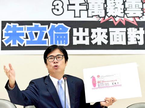 The legislator questioned the idea of KMT headquarters offering NT$30 million as campaign subsidy to Hung on Oct. 5, “when it was already decided on Sept. 25 by the KMT’s top echelons that Hung was to be replaced and on Oct. 3 Chu had asked Hung to be his running mate and KMT CSC member Chiang Shuo-ping (江碩平) said he would raise a proposal to replace Hung.”