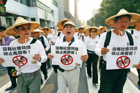 “We are concerned that the meeting will restrict future administrations [to a ‘one China’ framework], but because they will not sign a formal agreement, it is difficult for the Legislative Yuan to exercise its supervisory powers,” Restoration of Taiwan Social Justice’s research department director Lin Jia-yu (林家宇) said.