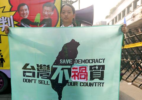Yesterday’s meeting between President Ma Ying-jeou (馬英九) and Chinese President Xi Jinping (習近平) prompted a protest outside the Presidential Office Building, with activists condemning the meeting and pledging to continue the fight against negotiations over the trade in goods agreement with China.