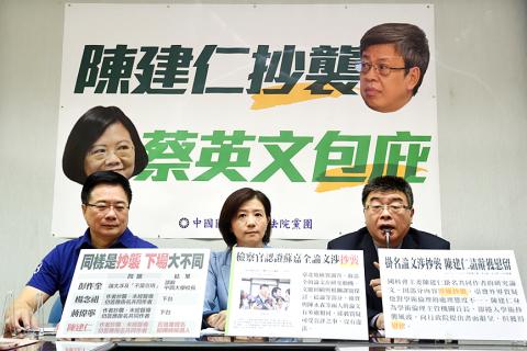Chinese Nationalist Party (KMT) lawmakers yesterday attacked former Academica Sinica vice president Chen Chien-jen (陳建仁), Democratic Progressive Party presidential candidate Tsai Ing-wen’s (蔡英文) running mate, for alleged plagiarism in a paper he co-authored in 2007.