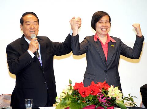 People First Party (PFP) presidential candidate James Soong (宋楚瑜) yesterday announced Republican Party chairperson Hsu Hsin-ying (徐欣瑩) will be his running mate in the Jan. 16 election, as part of his campaign promise to form a coalition government.